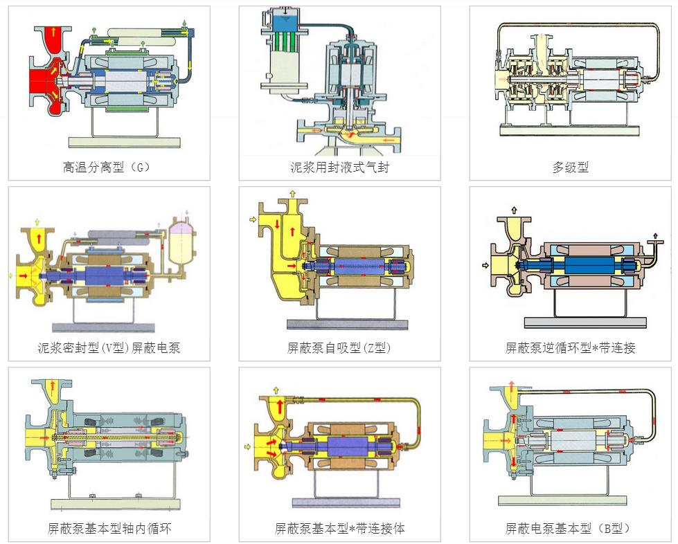 用将定子绕组和转子绕组分别置于密封金属筒体内的屏蔽电动机驱动、泵壳与驱动电机外壳用法兰密封相连,取消了泵轴动密封结构的泵。适于输送贵重液体或带放射性的液体。屏蔽泵是一种无密封泵,泵和驱动电机都被密封在一个被泵送介质充满的压力容器内,此压力容器只有静密封,并由一个电线组来提供旋转磁场并驱动转子。这种结构取消了传统离心泵具有的旋转轴密封装置,故能做到完全无泄漏。
