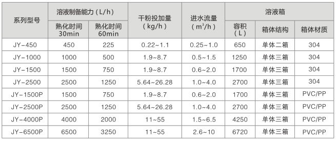 聚合物溶液制备过程是通过各个溶液箱分级逐步处理完成的,溶液箱之间隔开。每个溶液箱内的反应时间和恒定的浓度,避免在预制箱和终溶液箱之间产生任何直接通路。该设备由控制箱自动控制,此控制箱与安装在终溶液箱上的液位计相连,一旦液位达到“低位”,触发电动进水阀打开。触点式流量计就启动干投机,干投量的大小按照水量而定,以获取的浓度。一旦达到“高位”此循环过程就停止。当然两(或三个)搅拌器还在工作。该设备还用于将乳胶状的阳离子、阴离子或无离子型的聚合物连续自动的制成标准稀释浓度(0.3-5g儿)的溶液。尽管一般认为乳胶状的聚合物制成标准溶液所需的熟化时间大大少于粉粒状聚合物。但是在将药耗达到状态过程中总是推荐要充分的熟化时间。