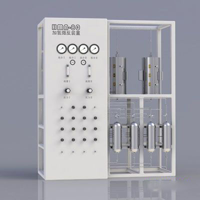 小型加氢反应试验装置是三个催化剂装量为500ML的反应器的串级反应试验装置。固定床反应器,装置配有新氢流路、补氢流路、吹扫N2流路和循环氢四条气体流路。根据不同试验要求可实现不同氢油比条件下的加氢催化反应。不但适合轻质油为原料,还可用于重质油加氢工艺。氢气流路设置压力调节阀,控制和稳定反应器入口压力,高分离罐分离气体出口设有背压阀和气动调节阀,稳定反应器出口压力。气体流量采用质量流量控制器实现流量的自动检测和控制。反应炉采用六段加热与控制,催化剂在足够的等温区内实现等温反应。气体产物在线计量放空或接收,液体产物可进入分馏塔和稳定塔,进行产品切割和收集。本装置可进行单程和循环反应。根据循环氢的流量和反应器出口压力变化,实现新氢补充量的自动控制与检测。